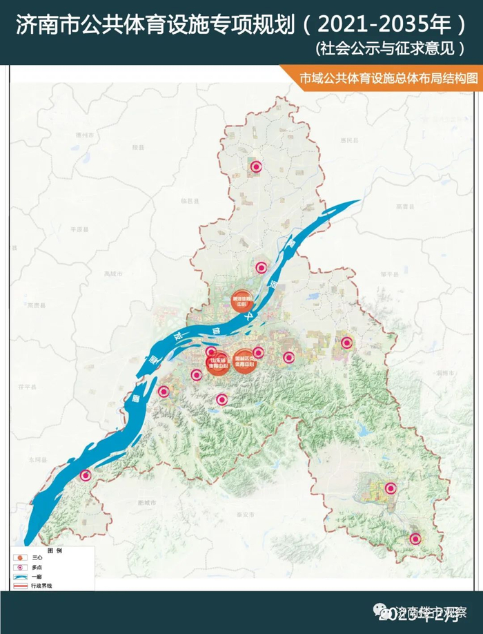根据规划,济南体育设施总体布局是:一廊:黄河文体发展廊;三心:黄河体育中心;省体育中心;奥林匹克体育中心;多点:多个区级公共体育设施。
