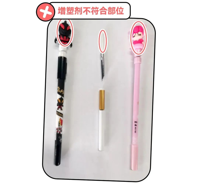 风险:通常,一些学生会无意识啃咬笔帽、笔套等,若塑料文具增塑剂超标严重,孩子长时间接触,可能会影响儿童身体健康。