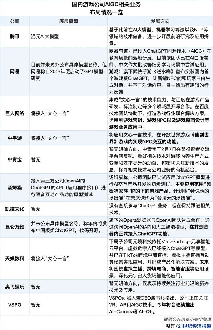 眼光放至国内,2023年年初以来,亦有多家企业高调宣布入局AIGC。长期聚焦游戏产业与前沿技术交叉领域的南财合规科技研究院数字娱乐课题组注意到,不少游戏企业正在试图向这一技术靠拢。在百度官宣将在3月推出的“文心一言”项目后,多家科技企业宣布将同步接入,而其中亦不乏游戏企业的身影。