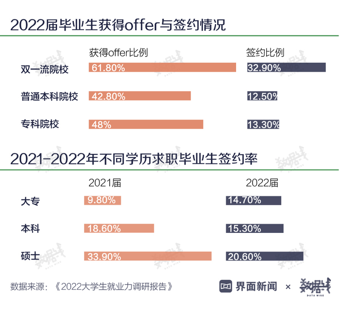 智联招聘《2022大学生就业力调研报告》显示,从签约率上看,双一流院校毕业生优势明显,专科院校毕业生签约率高于普通本科。