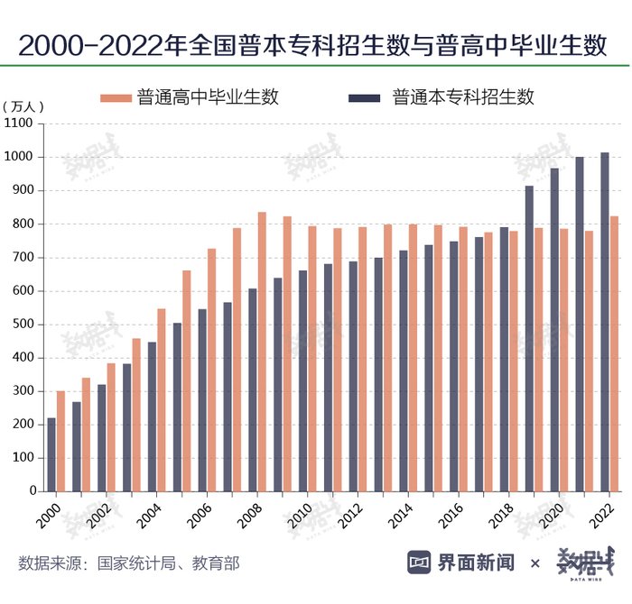 2018年,全国普通高中毕业生数自2000年来首次少于普通本专科招生数,并持续至今。近年来,二者的差值增至200万人,截至目前,仍有继续扩大的趋势。