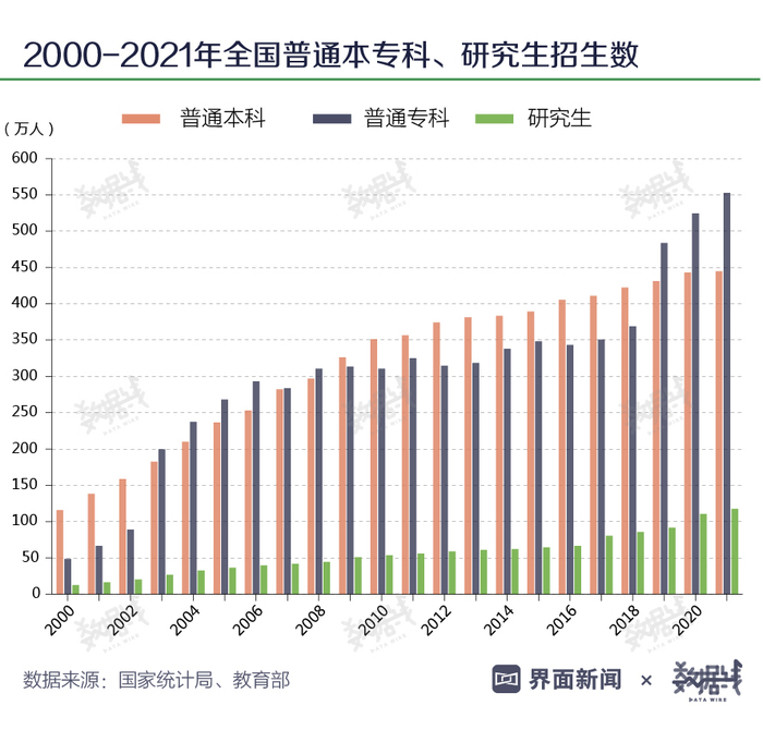 从招生规模上看,2000-2021年,全国普通本科招生数扩大近3倍,普通专科招生数则上涨超10倍,研究生招生数上涨超8倍。2019年,全国普通专科招生数达到483.6万人,较前一年扩招115万人,自2009年以来首次超过本科招生数。