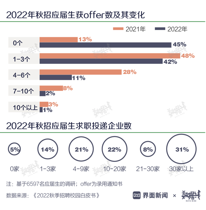 据《2022秋季校园招聘白皮书》,在调研的6597名应届生中,有61%的应届生在2022年秋招中投递超20家企业,同比增长22%,甚至31%的学生投递超30家以上。在2022年秋招中,有45%的应届生收到企业录用通知数量为0,而2021年秋招该比例仅为13%。