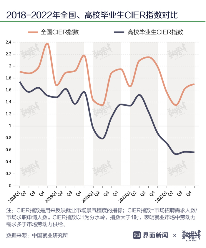 中国就业研究所联合智联招聘发布数据显示,截至2022年第四季度,高校毕业生CIER指数已连续5个季度低于1,这意味着在大学生就业市场中劳动力需求持续少于市场劳动力供给,就业市场景气程度低。但从整体上看,全国CIER指数实现连续2个季度上涨,2022年第四季度达到1.7,但仍低于去年同期水平。