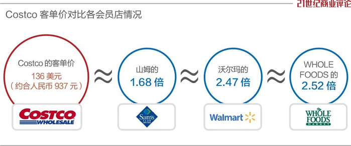 perfect price的调研显示,开市客的客单价为136美元(约合人民币937元),是山姆的1.68倍、沃尔玛的2.47倍、Whole Foods的2.52倍。