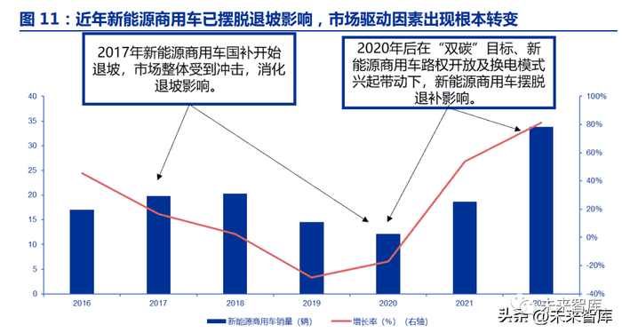 新能源商用车市场已逐渐消化国补退坡影响,能源转型、路权开放以及换电技术发展 取代补贴成为销量增长主要因素。2017 年后数年的销量下滑,一方面来自于国补退坡带来 的吸引力下降,另一方面源于新能源车在续航以及应用场景上相对燃油车优势不大。2020 年后新能源商用车销量复苏,表明市场驱动因素已出现根本转变,原因主要有三点:①在 “双碳”目标驱动下,国家对国三及以下的柴油重卡政策逐步收紧,并加紧淘汰,支撑新 能源商用车需求;②各大城市对新能源商用车给予更多路权优惠,如扩大通行范围、延长 通行时间等;③换电模式日渐成熟,落地场景逐渐丰富。