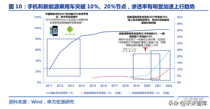 对比手机及新能源乘用车,新能源商用车处于需求爆发起点。行业渗透率有三个关键 节点:10%、20%以及 40%。渗透率达到 10%,行业将从导入期迈入成长期,行业增速将 进入新阶段;达到 20%,渗透率提升速度将进一步加快;达到 40%则意味着行业进入成熟 期,行业需求逐步见顶。其中中国智能手机行业于 2011 年进入 20%渗透率加速关口,之 后 1-2 年时间迅速突破 40%渗透率节点进入成熟期。新能源乘用车则在 2021 年渗透率达 到10%迈入成长期,行业需求还处于加速释放阶段。新能源商用车于2022 年也迈入了10% 的渗透率节点,预计未来数年将迎来新能源商用车需求爆发期。