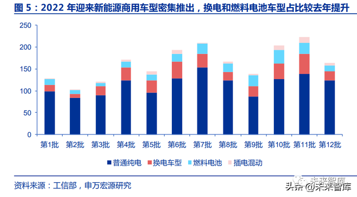 2022 年迎来新能源商用车型密集推出,换电和燃料电池车型占比较去年提升。2022 年全年工信部新能源车型推荐目录共列入 1966 款新能源商用车型,较 2021 年的 1320 款同比增加 48.9%。其中 2022 年全年换电和燃料电池车型共推出 530 款,较 2021 年增 加 233 款,占比从 2021 年的 22.5%提升至 2022 年 27.0%。2022 年新能源重卡也迎来 车型密集上市,全年共推出 14 吨以上新能源重卡 898 款。