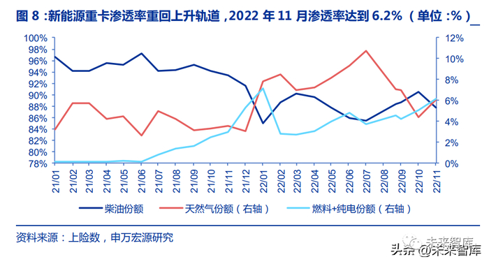 商用车细分市场中,2022 年新能源轻微卡实现高速增长,渗透率创新高。销量方面, 2022 年 1-11 月,轻微卡销量为 157.7 万辆,同比下滑 27.9%。新能源轻微卡销量为 8.1 万辆,同比增长 68.5%,实现销量逆市增长。主要是由于新能源轻微卡购置税以及车辆养 护成本上较传统燃油车型具备优势,对轻微卡市场中的价格敏感型用户有吸引力。渗透率 方面,轻微卡渗透率 11 月达到 10.1%,随着经济进一步复苏,货运需求改善将带动新能 源渗透率进一步提高。