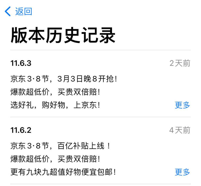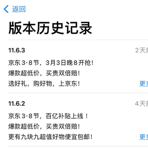 在随后的京东APP更新记录中,京东”百亿补贴“的消息得到进一步验证。2月26日,该平台更新至11.6.2版本,在版本介绍中,京东提到“京东3·8节,百亿补贴上线;爆款超低价,买贵双倍赔”。3月1日,京东APP再次更新,版本介绍显示,京东3·8节将于3月3日晚8点开抢。