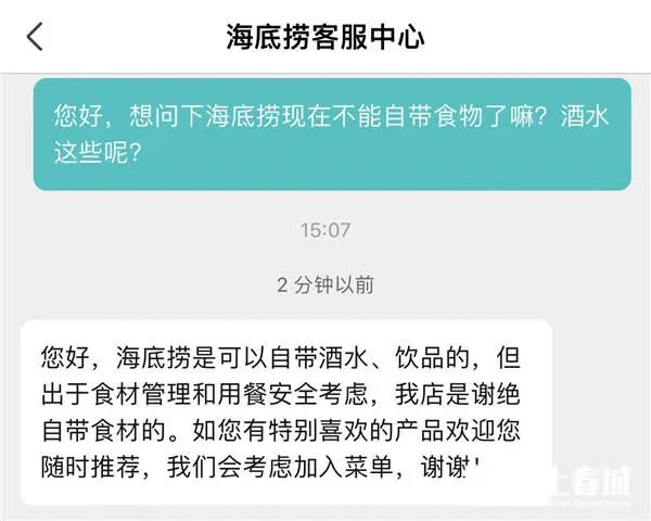记者随后也联系了海底捞客服中心,得到了同样的回复:海底捞是可以自带酒水、饮品的,但出于食材管理和用餐安全考虑,所有门店是谢绝自带食材的。如顾客有特别喜欢的产品,欢迎随时推荐,我们会考虑加入菜单。