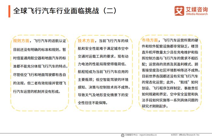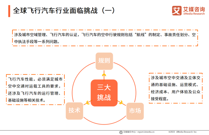 飞行汽车现面临三个挑战:规则方面的挑战、市场方面的挑战和技术方面的挑战。