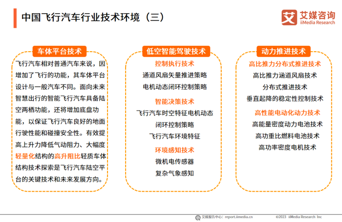 飞行汽车所需三个技术:车体平台技术、低空智能驾驶技术和动力推进技术。