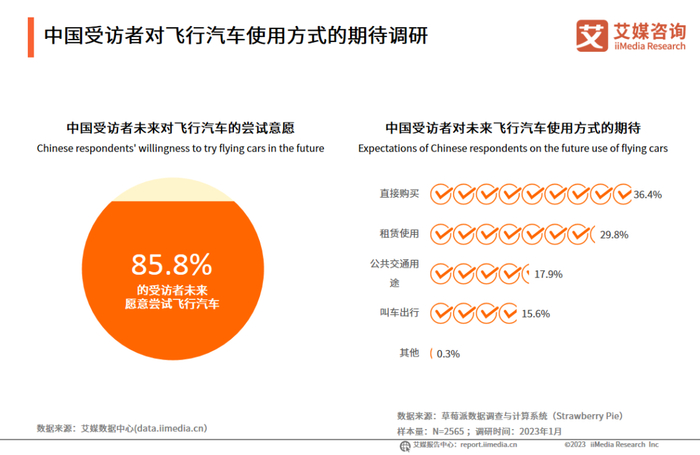 数据显示,85.8%中国受访者表示未来愿意尝试飞行汽车产品及服务,其中36.4%的受访者偏向直接购买一辆飞行汽车,29.8%的受访者偏向租赁飞行汽车使用。艾媒咨询分析师认为,受访者对飞行汽车接受程度保持乐观,未来私人飞行汽车市场占到主流。