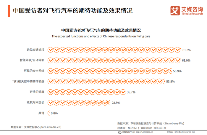 数据显示,61.3%的中国受访者期待飞行汽车解决交通拥堵问题,61.0%的消费者期待飞行汽车智能驾驶/自动驾驶。艾媒咨询分析师认为,飞行汽车的商用价值体现在交通顺畅和提升居民便捷出行体验,未来市场潜力巨大。