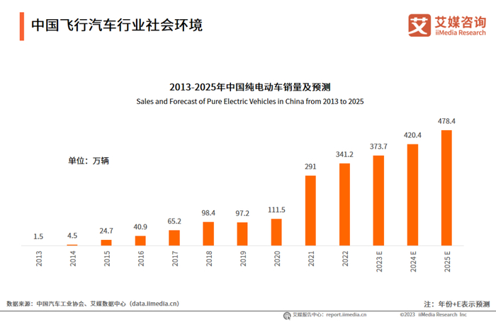 数据显示,2023年中国纯电动车销量将达373.7万辆。艾媒咨询分析师认为,近年来随着国产电动车品牌的兴起,国产电动车企业研发技术也在不断提升,其产品也逐渐受国人欢迎,为研制飞行汽车打下坚实的基础,有利于飞行汽车行业的进一步发展。