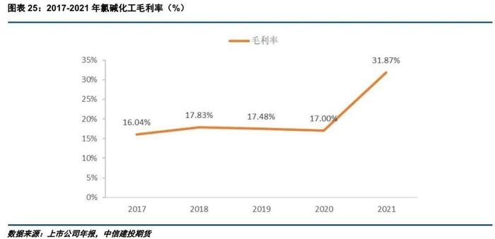 进一步分析可知,2021年氯碱化工的每股盈利和ROA、ROE指标均明显领先于其它几家烧碱相关的上市公司,其负债率也只有20%左右,财务状况表现最佳。中泰化学ROA垫底,主要是由于其贸易类的营业收入占比较高但收益率较低,且资产和负债规模都较大。五家样本公司中,2021年中泰化学的毛利率处于最低水平,滨化股份毛利率最高,北元集团和新疆天业毛利率差距不大。