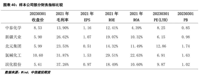 整体来看,截至2023年3月1日,北元集团和中泰化学的A股市值略高于200亿元,氯碱化工、新疆天业和滨化股份的市值在100亿元附近。北元集团和中泰化学市值更高,一方面是由于其盈利能力优于另外三家公司,另一方面是由于其区位优势明显,且产业链较为完整,竞争优势更强。以2017-2021年数据进行分析,北元集团盈利能力最稳定,五年平均的归母净利润为16.77亿元;中泰化学利润波动较大,但五年平均归母净利润为16.04亿元;氯碱化工、滨化股份、新疆天业五年平均归母净利润分别为10.47、8.20、7.17亿元。从数据可以发现,5家样本公司过去五年平均的盈利能力和其A股市值大小呈现正相关关系。