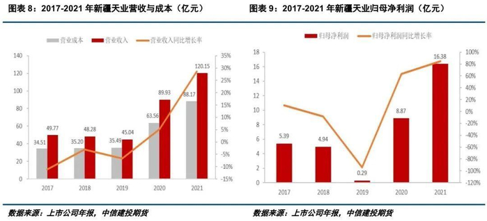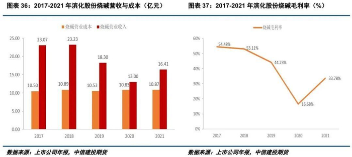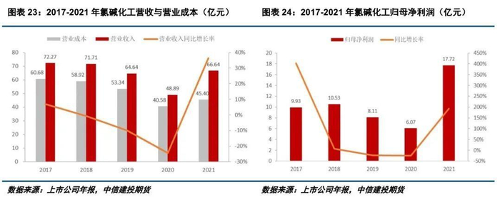 由于新疆天业年报中仅2020年和2021年披露烧碱相关的营业收入、营业成本和毛利率数据,此处仅分析2020和2021年数据。受到能耗双控等因素影响,2021年公司烧碱的成本和价格均出现上涨,但烧碱现货价格涨幅大于成本端涨幅,故2021年公司烧碱的毛利率较2020年增加8.74%至21.75%。