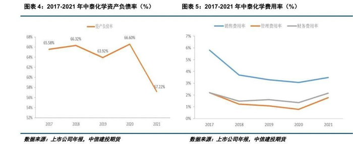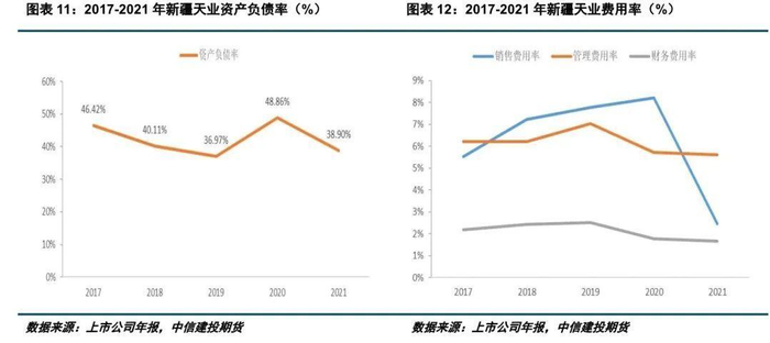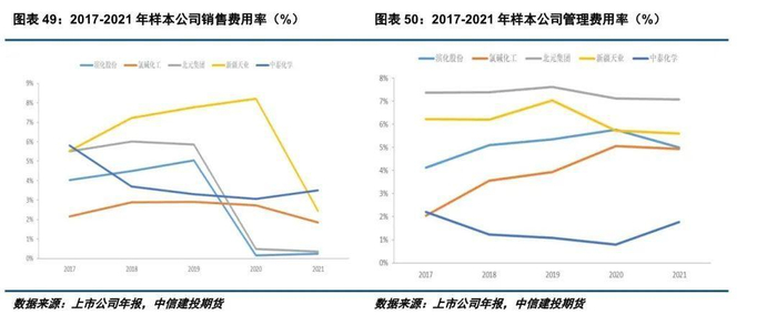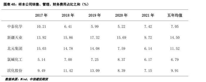以最新的2021年数据为例,除新疆天业的期间费用率明显较高外,其余四家公司的期间费用率均在6-7%左右,差距并不大。