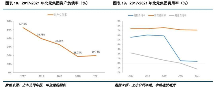 财务方面,近五年北元集团资产负债率和费用支出呈现下降趋势。2017-2021年,公司资产负债率从52.41%下降至19.78%,负债率处于较低水平,也明显低于业内其它公司。期间公司费用支出呈现稳中略降的趋势,其中管理费用率较为稳定,基本在7%左右;销售费用率受新会计准则影响出现下降;财务费用率随负债减少出现下降,2021年公司利息收入明显增加、利息支出大幅减少导致财务费用率转为负数。