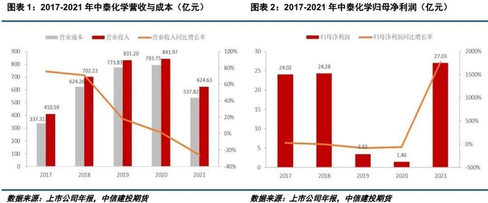 整体来看,2017年以来,中泰化学营业成本和营业收入呈现先升后降的趋势,净利润与毛利率呈现先降后升的趋势。2017-2020年,公司营业成本自337.31亿元增加至793.75亿元,期间营业收入从410.59亿元增长至841.97亿元。2021年公司营业成本和营业收入分别下降至537.82、624.63亿元,2021年公司营收和成本下降,主要是受出售子公司上海多经60%股权并不再纳入合并报表影响。2017-2020年,中泰化学综合毛利率自17.85%下降至5.73%,2021回升至13.90%。受毛利率波动影响,其归母净利润自2017年的24.02亿元下降至2020年的1.46亿元,2021年回升至27.03亿元。