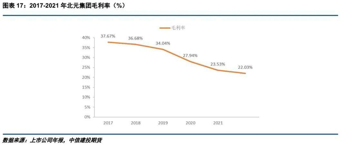 整体来看,近五年北元集团的营业收入、营业成本和净利润呈现先稳后升的趋势,净利润呈现稳中略升的趋势。2017-2020年,北元集团的营业成本变化不大,基本在60-70亿元,期间营业收入在100亿元左右,归母净利润在16亿元附近。2021年受到能耗双控和国内经济复苏影响,电石、PVC、烧碱等价格都出现大幅上涨,北元集团的营业成本和营业收入都明显增加,其中营业成本增长41.67%至100.59亿元,营业收入增长33.49%至131.54亿元,归母净利润增长9.87%至18.50亿元。2017-2021年,北元集团毛利率呈现下行趋势,其毛利率从2017年的37.67%下降至2021年的23.53%。2022年北元集团营收下降4.29%,但归母净利润下降21.72%,主要是由于公司主要产品PVC价格跌幅较大。