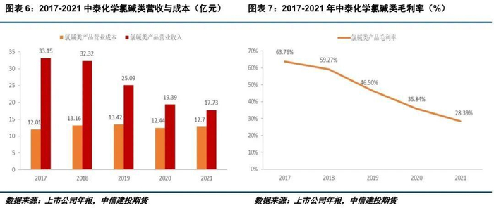 成本和费用方面,近五年中泰化学氯碱类产品的营业成本较为稳定,营业收入呈现下降趋势。2017年至2021年,中泰化学营业成本维持在13亿元附近,营业收入从33.15亿元下降至17.73亿元。期间氯碱类产品的毛利率从63.76%下降至28.39%。