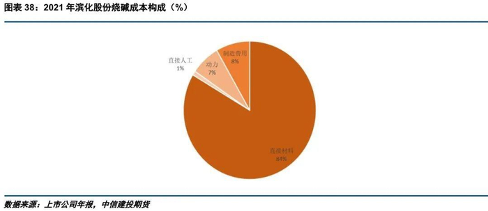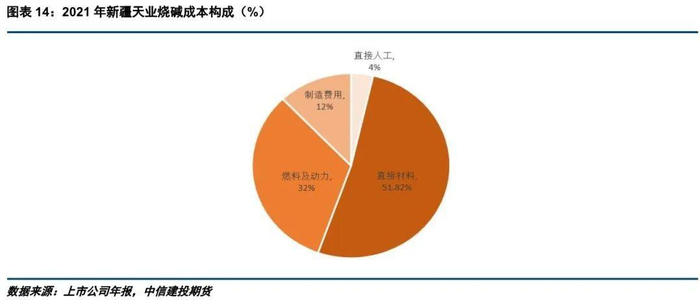 成本构成方面,以2021年数据为例,新疆天业的烧碱成本中,燃料动力占比为32%,直接材料成本占比约为51.82%,制造费用占比约12%,直接人工占比约4%。