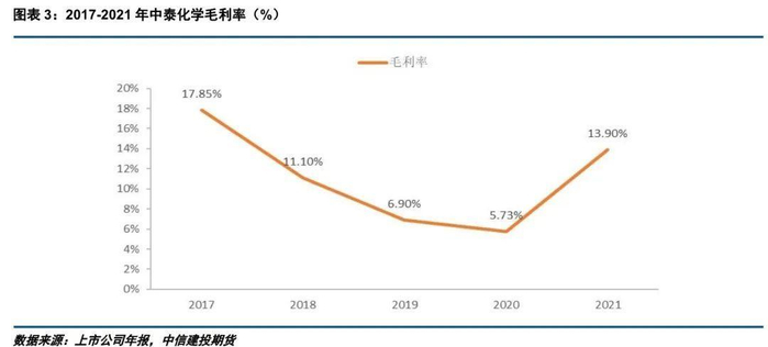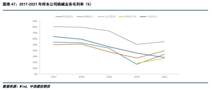 本文主要对国内烧碱产能前十的五家上市公司进行了比较分析,从纵向和横向角度分析了中泰化学、新疆天业、北元集团、氯碱化工和滨化股份的基本情况、财务状况、盈利和成本控制能力。受到行业周期影响,企业的盈利情况会出现较大的波动,但凭借成本和管理等优势,不同企业的抗风险能力表现各有不同。从毛利率表现和成本控制等角度来看,深耕氯碱行业的氯碱化工和滨化股份或是较好的投资标的;若考虑规模效应,中泰化学值得投资者长期关注。
