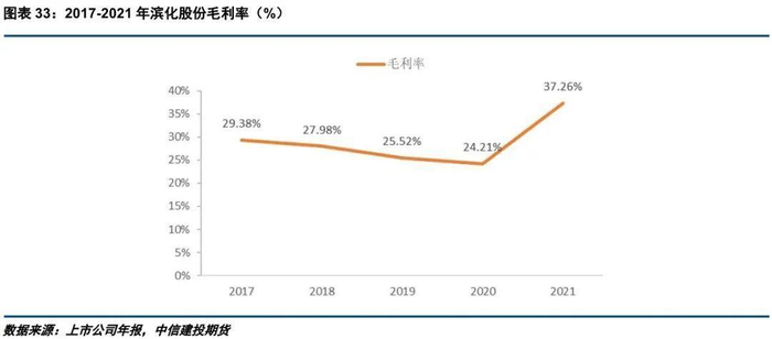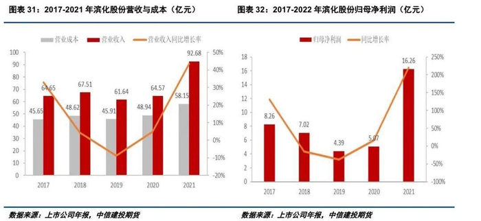 由于烧碱生产中电力的成本占比超过60%,下游需求变化较大、价格波动剧烈,2017-2021年滨化股份烧碱的营业成本基本稳定、营业收入及毛利率波动较大。成本构成方面,以2021年数据为例,滨化股份的烧碱成本中,能源即电力成本占比为58.34%,原盐等原材料成本占比为21.27%,直接人工占比约6.04%,折旧约6.99%。营收方面,烧碱的价格波动较大,导致营收波动明显。2017-2021年,滨化股份烧碱的营业收入从2017年的23.07亿降至2020的13.00亿元, 2021年增长至16.41亿。期间毛利率从2017年的29.38%下降至2020年的24.21%,2021年升至37.26%。2018-2020年烧碱的营业收入和毛利率下降,主要是受到下游需求走弱、供过于求所致;2021年能耗双控对供应端形成扰动,供应阶段性紧张推动烧碱价格大幅上涨。