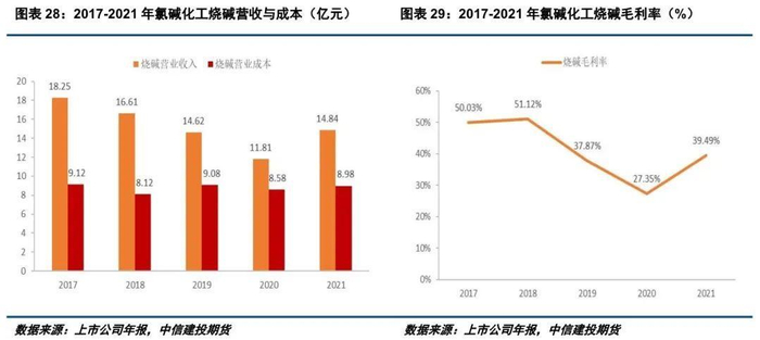 收入和利润方面,近五年氯碱化工的烧碱营收先降后升,毛利率先稳后升。2017-2021年,氯碱化工烧碱的营业收入从2017年的18.25亿元下降至2020年的11.81亿元, 2021年回升至14.84亿元。期间毛利率从2017年的50.03%下降至2020年的27.35%,2021年回升至39.49%。2018-2020年公司烧碱的营业收入和毛利率下降,仍然是受到烧碱行业周期性走弱影响;2021年供应端扰动推动烧碱价格大幅上涨,公司烧碱营收和毛利率都出现了明显回升。