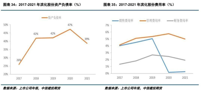 财务方面,滨化股份资产负债率呈现先升后稳的趋势,负债整体可控,费用率较为稳定。公司负债率自2017年起呈上升态势,2020年负债率升至47.33%的高位,2021年小幅回落至39%。近几年公司负债率上升,主要原因是公司规模扩大、产业转型升级、项目大量新建(碳三碳四综合利用项目),但财务杠杆仍维持在合理范围之内。从三费费率来看,近五年公司的费用率整体较为稳定。除2020年实行新收入准则导致销售费用率下降外,管理费用率和财务费用率较为稳定。2017-2021年,公司的管理费用率均在5%左右,财务费用率在2%左右。