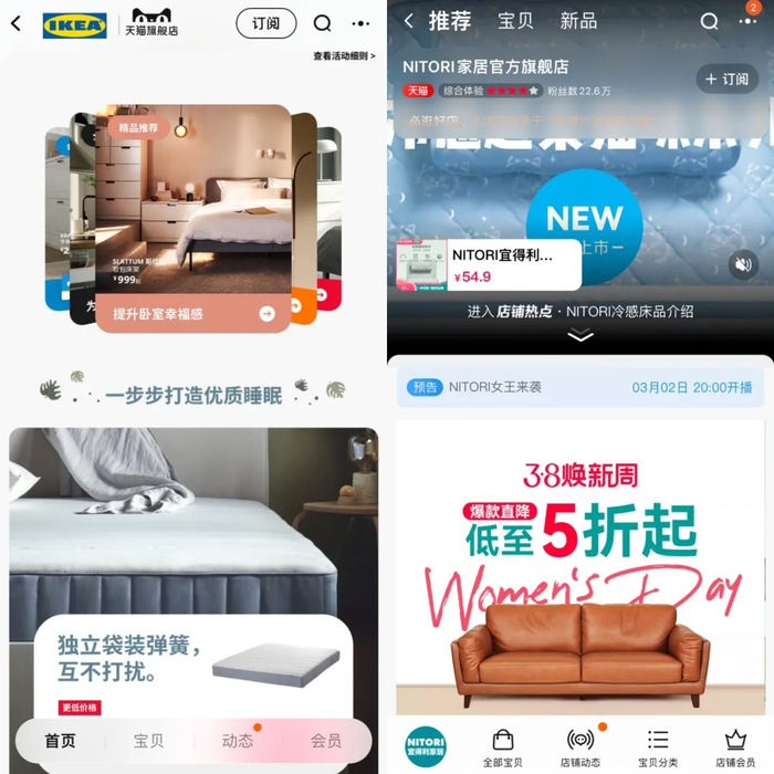 目前,两者的线上化都有了新进展。在NITORI和宜家天猫店,沙发、床等大件商品的详情页中,都推出了“放我家”看商品效果的页面——让消费者可以清楚商品是否和家里的风格与环境适配。此外,短视频和直播也成为这两个品牌吸引中国消费者下单的重要方式。