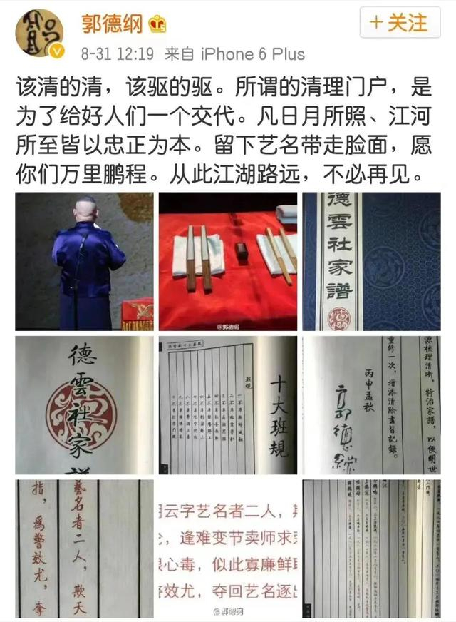 2016年,郭德纲晒出德云家谱,表示要“清理门户,给所有人一个交代”。直指曹云金、刘云天欺师灭祖,悖逆人伦,要求对方“留下艺名带走脸面”,逐出师门。