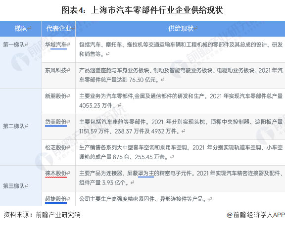 从我国本土汽车零部件布局来看,可大致将上海市汽车零部件分为三个梯队,第一梯队的企业包括华域汽车、东风科技等;第二梯队企业包括新朋股份等;第三梯队企业主要有徕木股份、超捷股份等。