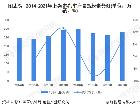 2014-2021年上海市汽车产量呈波动变化趋势。2020年受全球新冠疫情影响,上海市汽车产量较上年继续下降,为264.68万辆。2021年,在积极复工复产的背景下,上海市汽车产量有所回升,较2020年同比增加7.04%,升至283.32万辆。随着下游汽车产量的逐渐增加,预计汽车零部件行业需求也将随之增加。