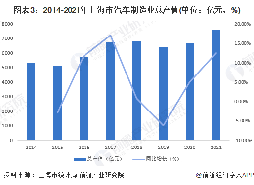 汽车制造业总产值中包含汽车零部件制造产值,因此以下选用汽车制造业总产值来分析供给现状。上海市统计局2021年的年报数据显示,上海当年汽车业全年共生产汽车283万辆,产值7586亿元,营业收入8685亿元,利润总额达到了598.73亿元,上海市规模以上企业总产值的19.2%来自汽车行业。