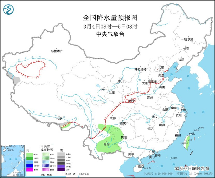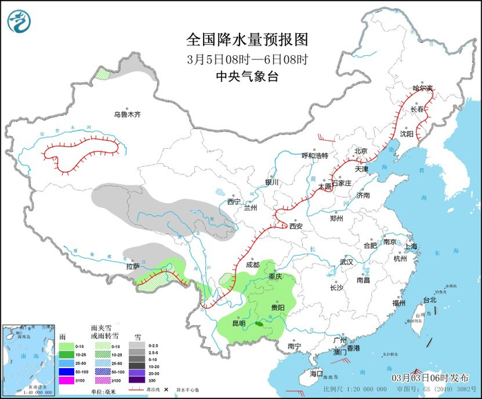 未来三天,我国大部地区雨雪依旧稀少,降水主要集中在西南地区且强度弱,预计四川南部、贵州大部、云南中东部、湖南南部、广西西部和北部等地有小雨,局地中雨。需要注意的是,今天,云南东北部和中部等地的局地将有雷暴大风或冰雹等强对流天气出现。6日开始,新疆北部及西南的地区雨雪会有所增强。