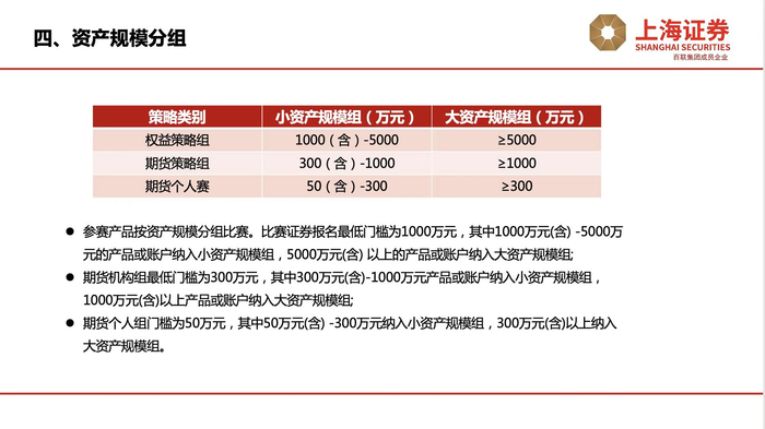 此外,每个策略大类都区分小资产和大资产规模组。对参赛产品的资产规模进行划分。其中,权益策略组报名的最低门槛为1000万元,期货策略组和期货个人组的最低门槛分别为300万元、50万元。