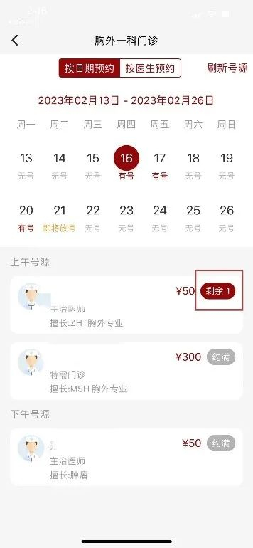 步骤六:选择挂号日期后查看当日剩余号源情况,点击相应医师号源的“剩余*”按钮