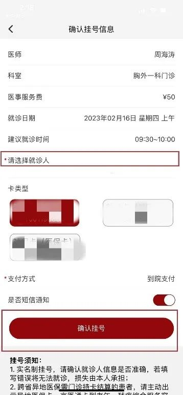 步骤七:核对挂号信息后,点击“请选择就诊人”,初诊患者请先按提示首诊建档,复诊已绑卡的患者直接选择就诊人即可,最后点击“确认挂号”