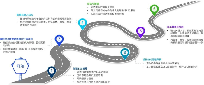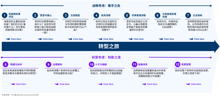 资产管理公司在开始其ESG转型之旅时,需要评估一系列全面的战略和运营考虑素因素: