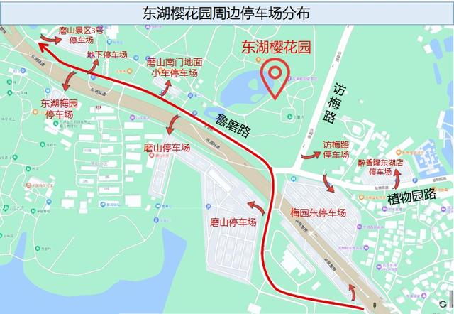 自驾:车辆可停靠在磨山景区停车场,共有3500个车位;也可以驾车前往「白马洲头」驿站停车场,然后乘坐观光车直达东湖樱花园。