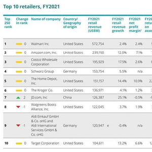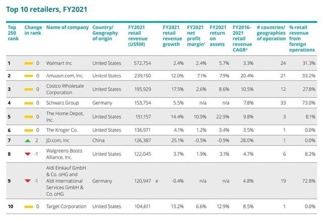 德勤2022全球零售250强名单:京东再次上榜全球零售十强
