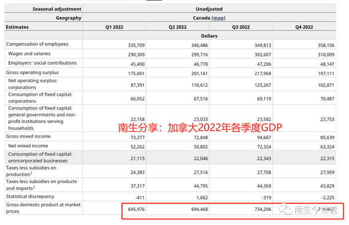 加拿大国家统计局公布的信息,2022年第一季度完成的名义GDP为6459.36亿加元,同比上涨3.8%;二季度上涨4.8%,完成的GDP为6944.68亿加元;三季度GDP为7342.06亿加元,与上年同期相比实际增长4.6%。
