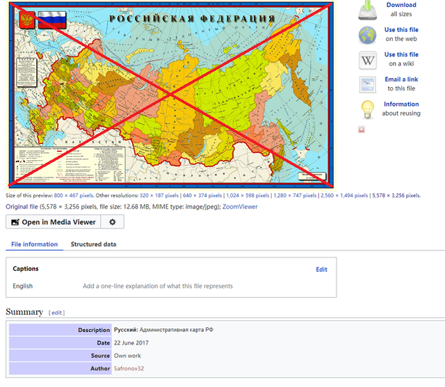 反搜网友发布的“新地图”截图,可以发现,这张被称作“俄罗斯国家杜马日前更新的地图”其实是一张旧图。美国非营利组织维基媒体基金会(Wikimedia Foundation)负责的多媒体资料库项目——“维基共享资源”(Wikimedia Commons)的记录显示,此图在2017年6月23日就已经出现,最近一次更新时间在2017年7月23日7时54分。图片由网友Safronov32自制(own work)完成,并非官方制图。