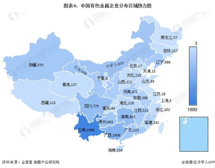有色金属行业产业链区域热力地图:云南地区有色金属相关企业最多