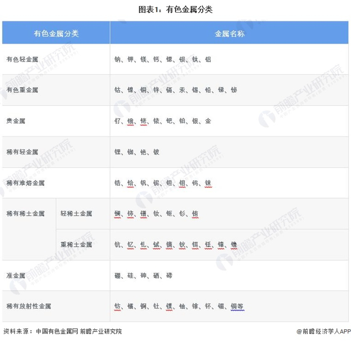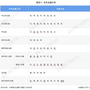 根据《大辞海》中相关定义,有色金属(Nonferrous Metals)是指除了黑色金属(Ferrous Metals)以外的所有金属,即指除了铁、铬、锰以外的所有金属。结合各类金属的自身属性以及其在行业中的用途,可以划分为有色轻金属、有色重金属、贵金属、稀有轻金属、稀有难熔金属、稀有分散金属、稀有稀土金属、准金属以及稀有放射性金属。