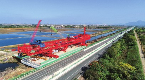 在中国东南沿海,中国首条跨海高铁——福厦高铁施工现场,重达近900吨的梁片,在世界首台千吨级架桥机“搬运”下,轻松完成拼接。